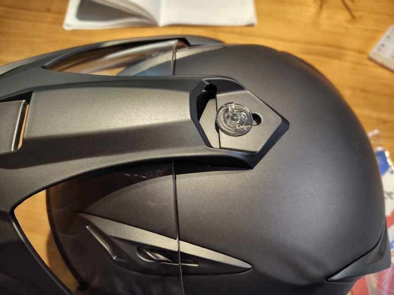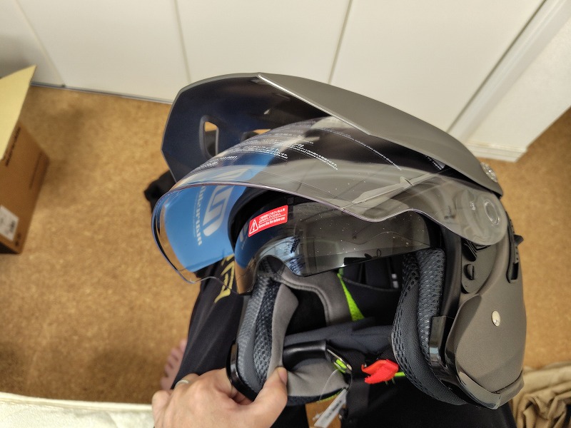 インナーバイザーの位置がだいぶ顔に近いです。ヘルメットを前向きに被ると、インナーバイザーを下した時に鼻に当たるときがあります。でも下ろしてしまえば走行中には当たりません。
