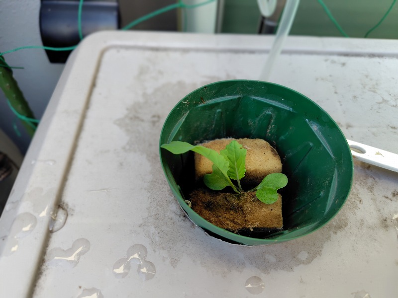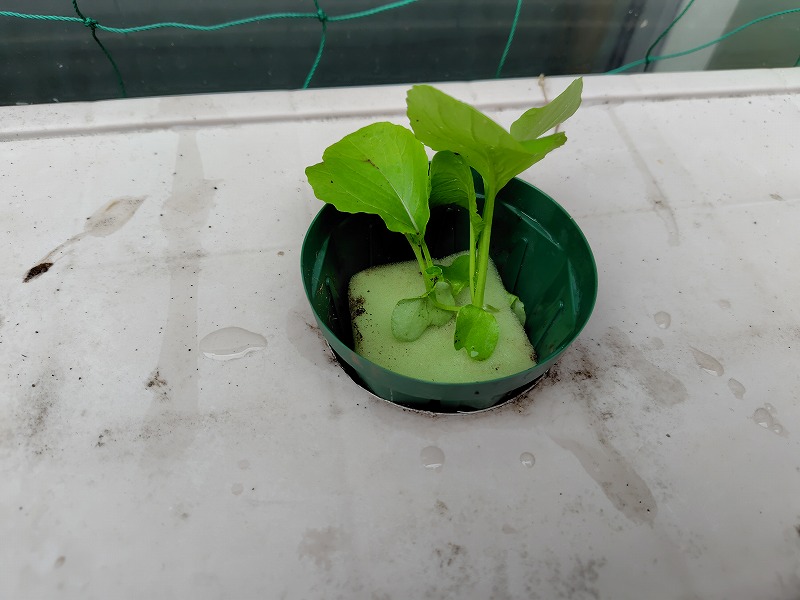畑には3週間前くらいに種を蒔いており、ちょうど水耕栽培に投入くらいの大きさに成長しています。小松菜は今回は1ポットに2株入れてみました。