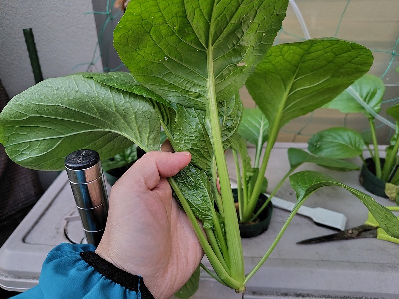 水耕栽培の小松菜一株を収穫しました。10/26に水耕栽培へセットして1か月とちょっとで収穫とは小松菜の成長早いですね。